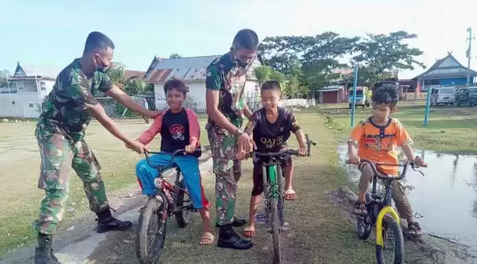 Seperti apa yang dilakukan oleh Pratu Feriana dan Prada Indar Jaya yang tergabung dalam Satgas TMMD ke-108 Kodim Jeneponto mereka terlihat asik bermain sepeda dengan anak-anak di Desa Bontorappo," Sabtu, 11 Juli 2020.