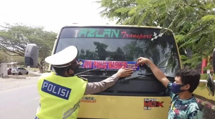 "Setiap kita melaksanakan operasi Yustisi kita menempel stiker yang bersifat ajakan untuk memakai masker pada angkutan umum dan membagi brosur untuk menerapkan 3M," ujarnya