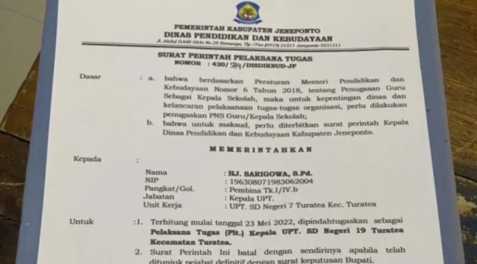 Langkah tegas dan cepat yang diambil Kadisdikbud Jeneponto itu dengan mengeluarkan surat perintah pelaksanaan tugas kepada Hj Sarigowa.