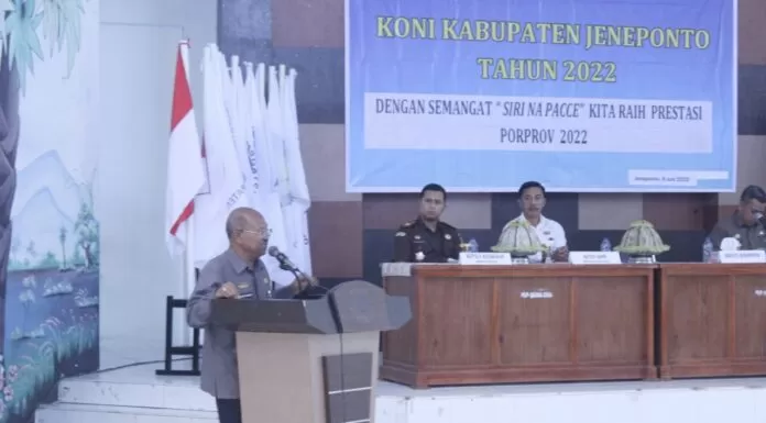 Bupati Jeneponto, Iksan Iskandar dalam sambutannya menyampaikan apresiasi dan penghargaan terhadap kinerja ketua KONI dan jajaran periode sebelumnya.
