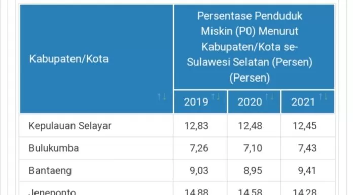 Dikutip dari laman sulsel.bps.go.id data Persentase Penduduk Miskin (P0) Menurut Kabupaten/Kota se-Sulawesi Selatan tahun 2010, Kepulauan Selayar 14,98 persen, Bulukumba 9,02 persen, Bantaeng 10,24 persen, Jeneponto 19,09 persen, Takalar 11,16 persen, Gowa 9,49 persen, Sinjai 10,68 persen, Maros 14,62 persen, Pangkep 19,26 persen, Barru 10,68 persen, Bone 14,08 persen, Soppeng 10,41 persen, Wajo 8,96 persen, Sidrap 6,99 persen, Pinrang 9,01 persen, Enrekang 16,84 persen, Luwu 15,43 persen, Tana Toraja 14,61 persen, Luwu Utara 16,24 persen, Luwu Timur 9,18 persen, Toraja Utara 19,08 persen, Makassar 5,86 persen, Pare Pare 6,53 persen, Palopo 11,28 persen.