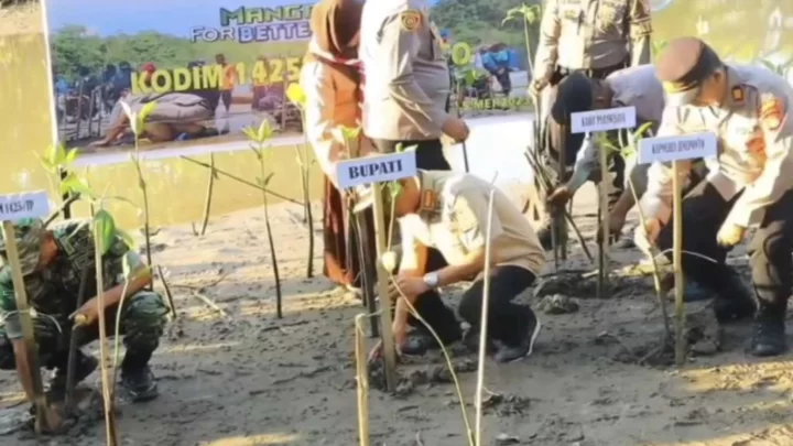 Terkini.id, Jeneponto - Peduli kelestarian alam, Komandan Distrik Militer (Dandim) 1425 Jeneponto, Letkol Inf Agus Tanra, bersama Bupati Iksan Iskandar dan unsur Forkompinda mengikuti Kick off penanaman pohon mangrove nasional, Senin, 15 Mei 2023.