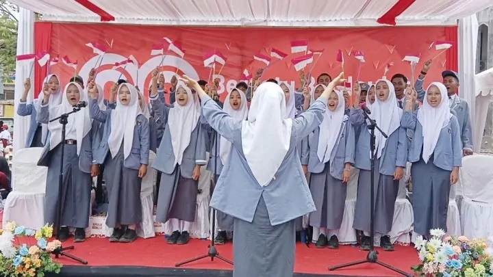 Dengan balutan seragam bernuansa abu-abu putih, para pelajar tersebut berhasil memukau peserta upacara melalui suara harmonis dan penghayatan yang kuat terhadap makna kemerdekaan.